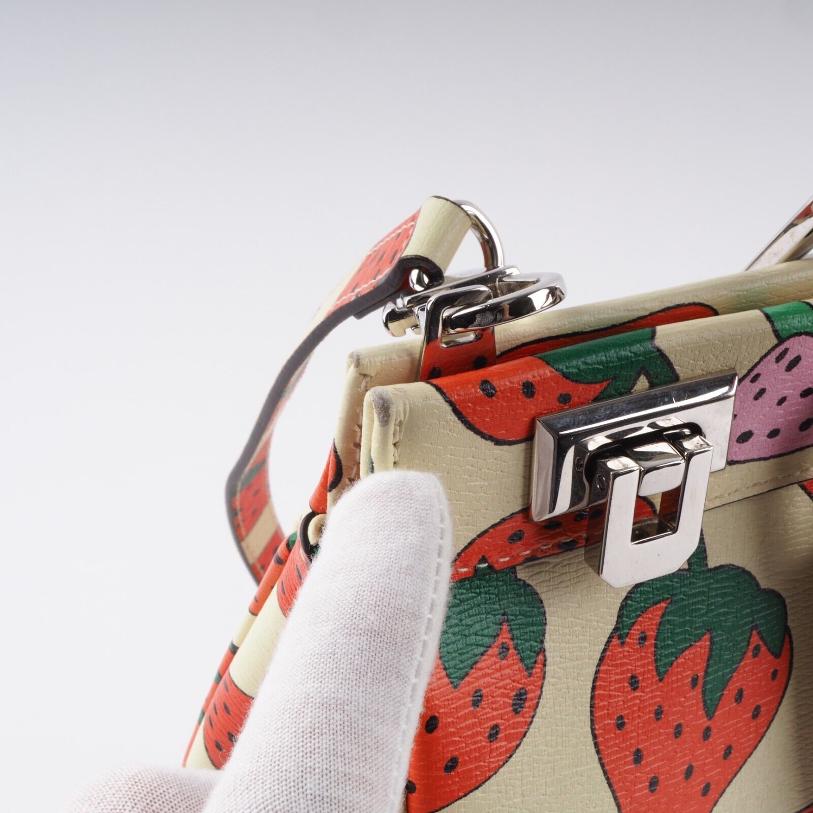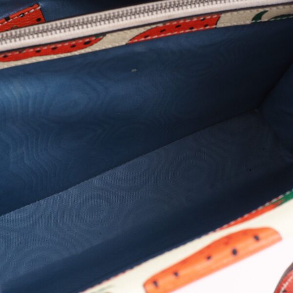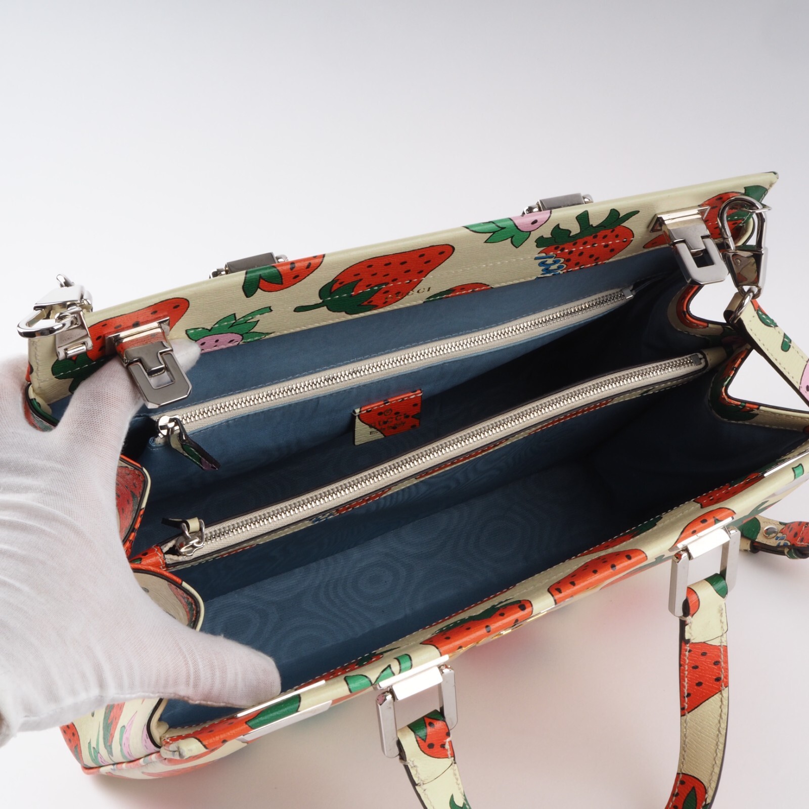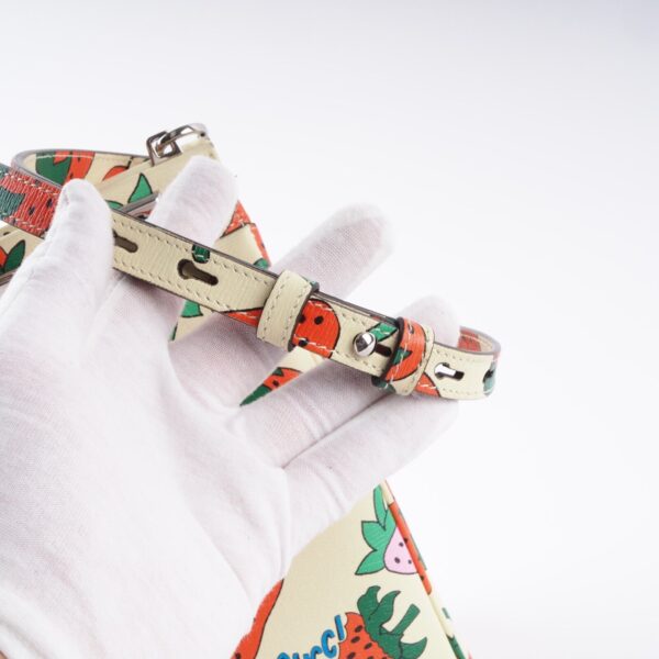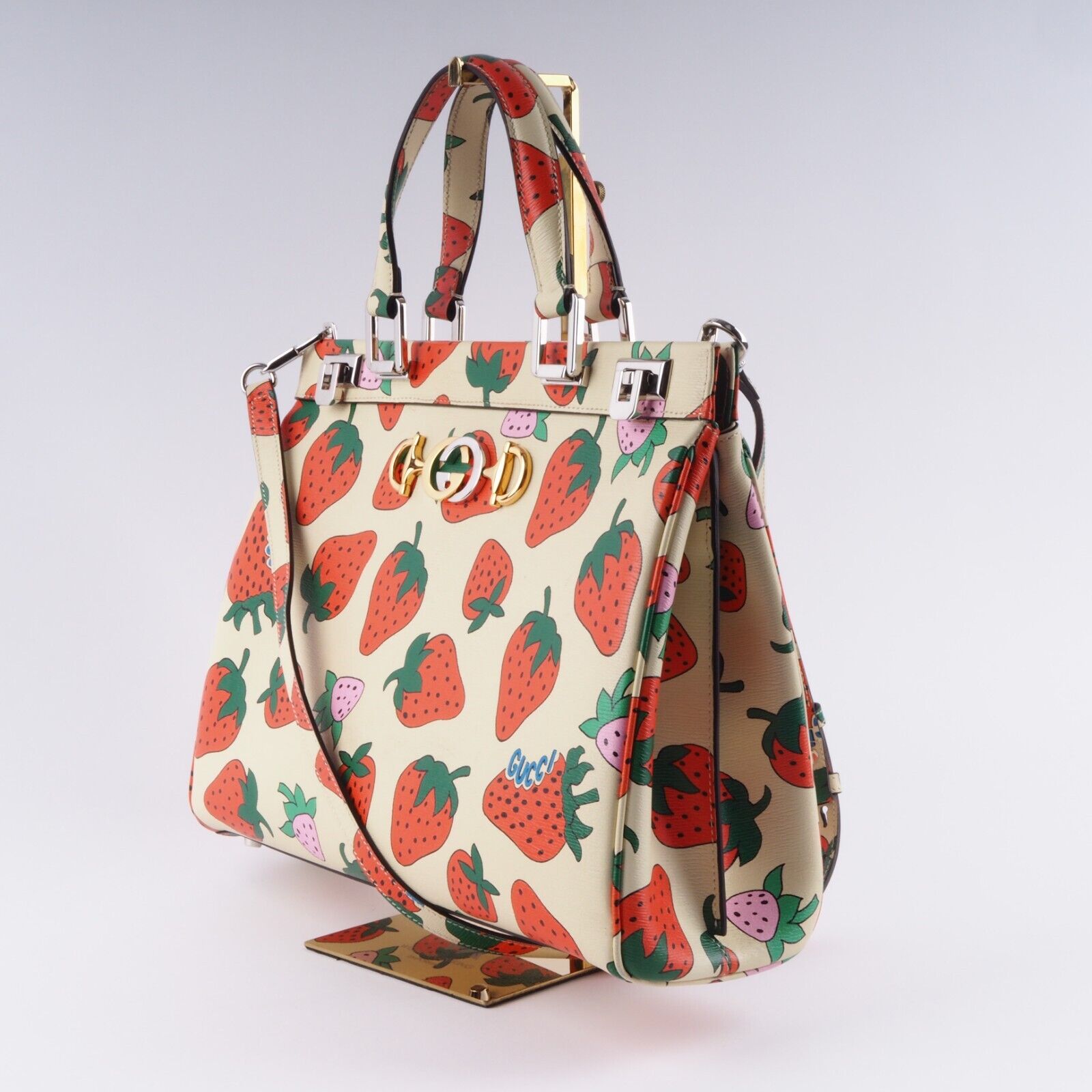 Diese seltene limiterte Zumi Top Handle Medium Tote von Gucci in beige- Strawberry Print ist in gutem gebrauchten Zustand. Die obere und untere Ecken haben ganz leichten Abreibungen – siehe Bilder. Sonst ist die Tasche sehr gepflegt und unbeschädigt. Der Innenfutter ist sauber und unbeschädigt. Die Tasche kommt mit einem verstellbaren abnehmbaren Schulterriemen, damit als Hand- Schulter- oder Umhängetasche targbar. Die Tasche kommt mit einem GUCCI Karton (etwas klein aber die Tasche passt knapp rein. Eine Ebay Staubbeutel inklusive. Mit gratis Ebay Echtheitsprüfung. Hergestellt wurde in Italien in 2021.